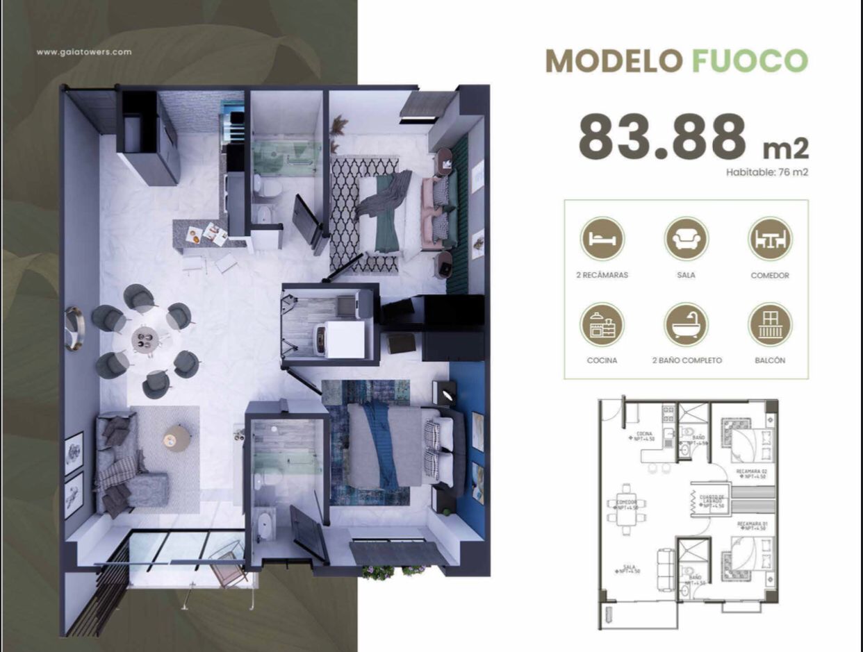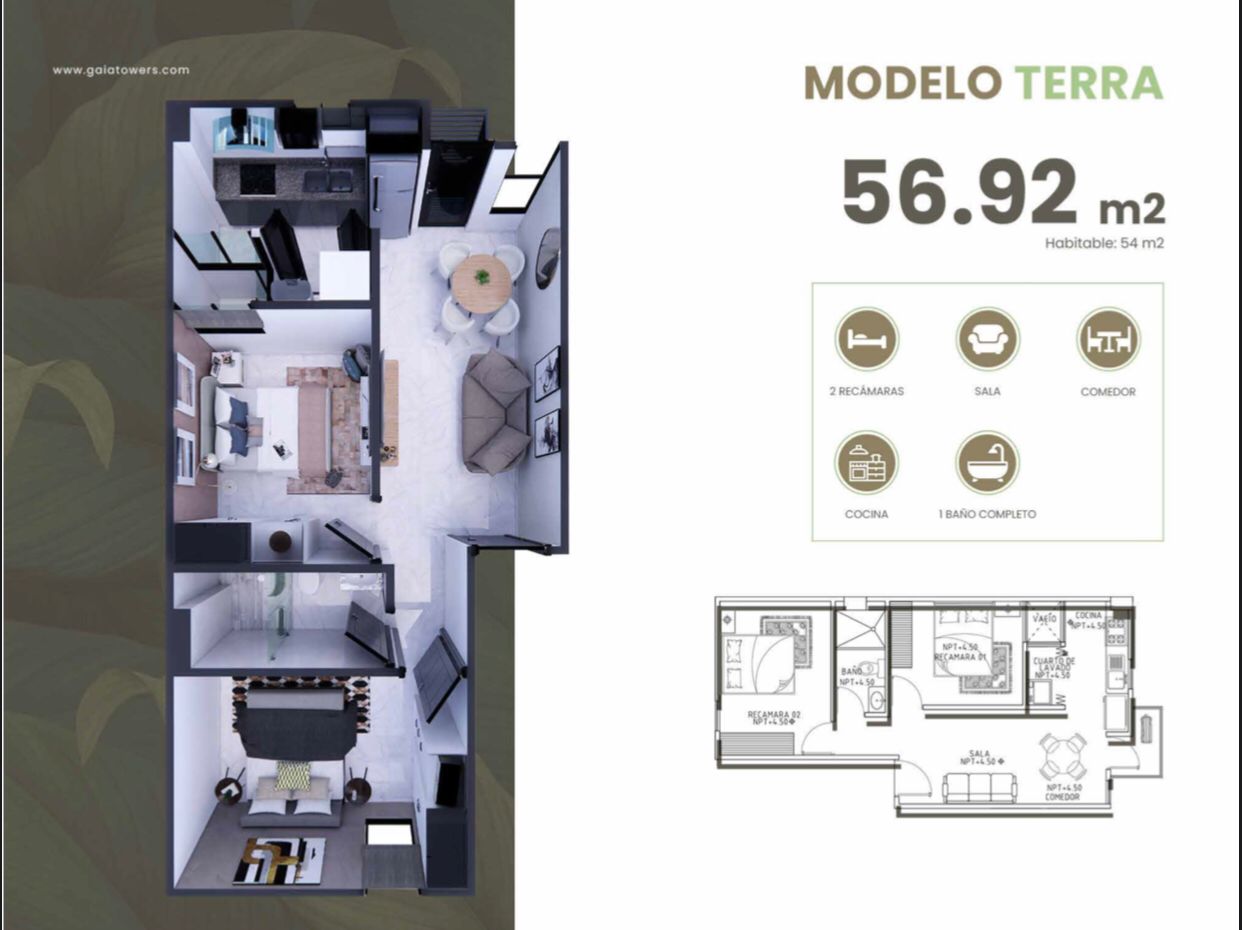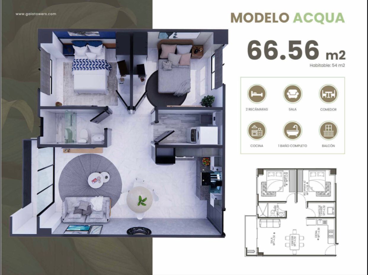 Modelo Acqua: (66.56 m2) 2 recamaras, 1 baño completo, sala, comedor, cocina y balcon.