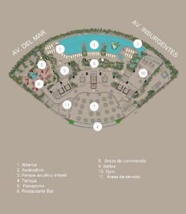 AMENIDADES (NIVEL 3) Alberca. Asoleadero. Parque Acuático infantil. Terraza. Paisajismo. Restaurante bar Áreas de convivencia. Baños. Gimnasio. Área de servicio.