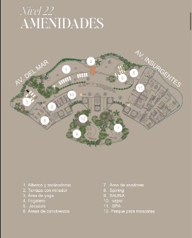 AMENIDADES (NIVEL22) Área de asoleadero. Terraza con mirador. Área de yoga. Fogatero. Jacuzzi. Áreas de convivencia. Áreas de asadores Spinning. Sauna. Vapor. SPA. Parque para mascotas.