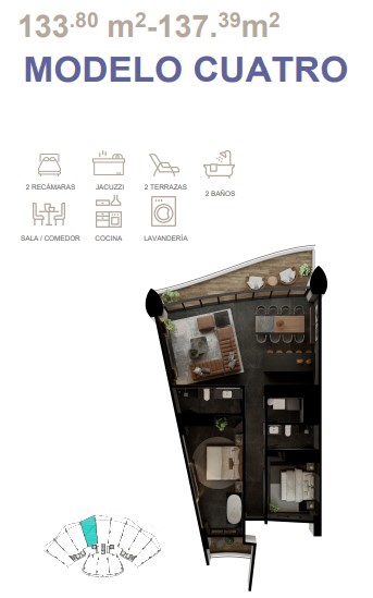 Torre a pie del malecón donde elegancia y confort se fusionan para ofrecer una experiencia inigualable. Se posiciona sobre un terreno de 3,148 m2 el cual incluye un total de 290 departamentos disponibles con medida de 96 m2 A partir de $4,937,000.00. hasta $11,005,389.95.